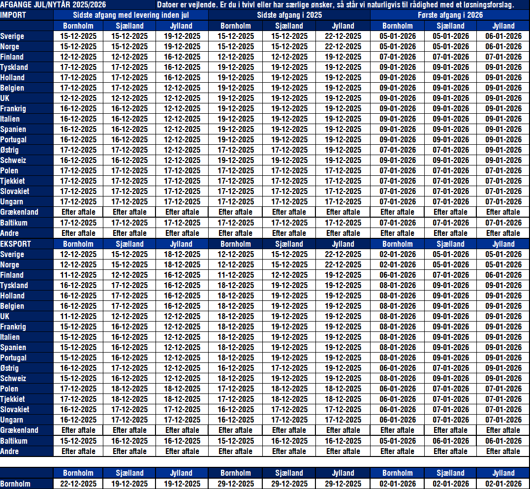Nedenfor ser du en oversigt over de justerede datoer for afgange og leveringer i forbindelse med Jul og Nytår i 2025/2026. Datoer er vejlende. Er du i tvivl eller har særlige ønsker, så står vi naturligvis til rådighed med et løsningsforslag.